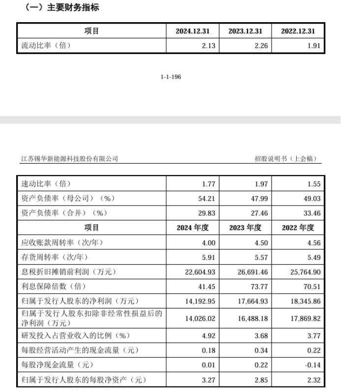 不仅如此,锡华科技的财务健康状况良好,公司近年保持稳健的资本结构,流动资产与负债比例处于合理区间,资产负债率持续优化。2022年至2024年,其流动比率分别为1.91、2.26和2.13,速动比率分别为1.55、1.97和1.77。公司合并资产负债率分别为33.46%、27.46%和29.83%,整体呈现下降态势,财务风险相对较低。而且应收账款与存货的周转率也都高于同行可比公司水平。如报告期内,同行可比公司应收账款周转率的平均值分别为3.70、3.44、3.61(次/年),锡华科技分别为4.56、4.50、4.00(次/年);又比如存货周转率同行可比公司平均值分别为4.46、3.66、3.24(次/年),而锡华科技分别为5.49、5.57、5.91(次/年)。