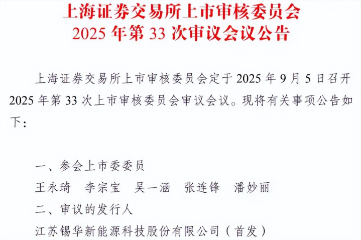 根据上交所上市审核委员会的安排,江苏锡华新能源科技股份有限公司(以下简称“锡华科技”)定于9月5日接受上交所上市审核委员会2025年第33次审议会议的审核。