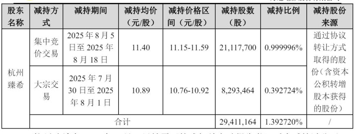 杭州臻希在2025年8月5日至2025年8月18日通过集中竞价交易减持21,117,700股,减持均价11.4元,套现2.4亿,减持比例为0.999996%;