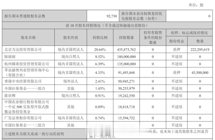 截至2025年6月30日,万达投资持股20.64%,陆丽丽持股为8.52%,杭州臻希投资管理有限公司持股6.39%,莘县融智兴业管理咨询中心(有限合伙)持股4.33%,香港中央结算有限公司持股为2.41%;